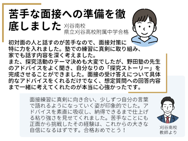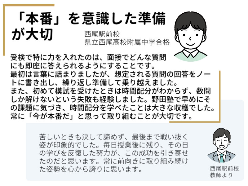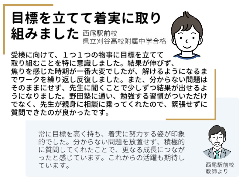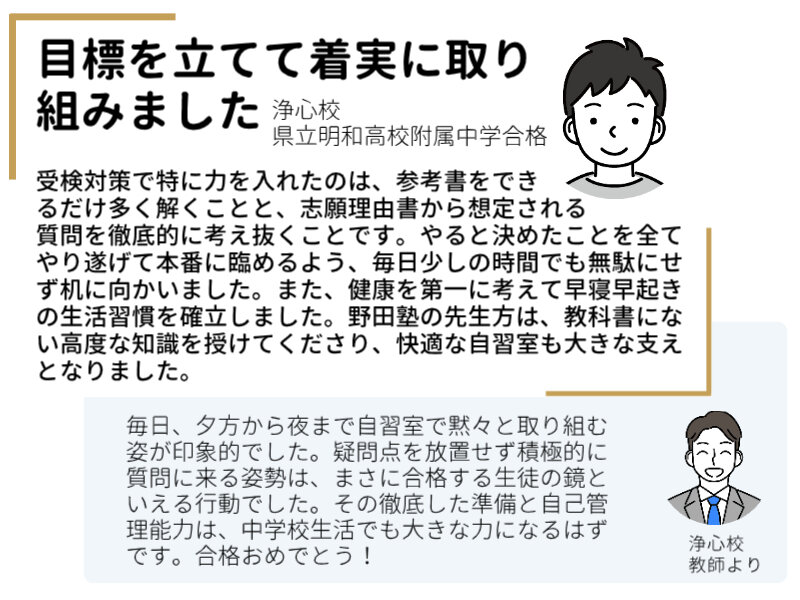 2026年度|愛知|公立中高一貫校合格者実績 合格者の喜びの声 主な公立中高一貫校の合格者実績 学校名 合格実績 明和高校附属 1名 津島高校附属 14名 学校名 合格実績 刈谷高校附属 4名 西尾高校附属 4名 学校名 合格実績 時習館高校附属 1名 愛知総合工科高校附属 1名 ※ 2026年度入試のみの実績で、複数年度の累計ではありません。※ 野田塾生のみの合格者数で、短期の講習生・模試生を含んでいません。