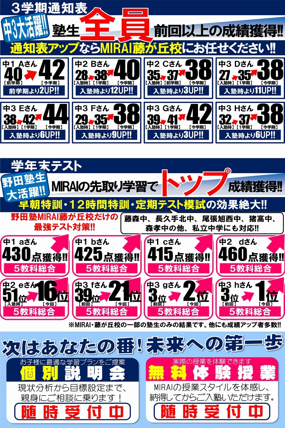 集団個別指導専門館MIRAI 藤が丘校 塾生成績発表!