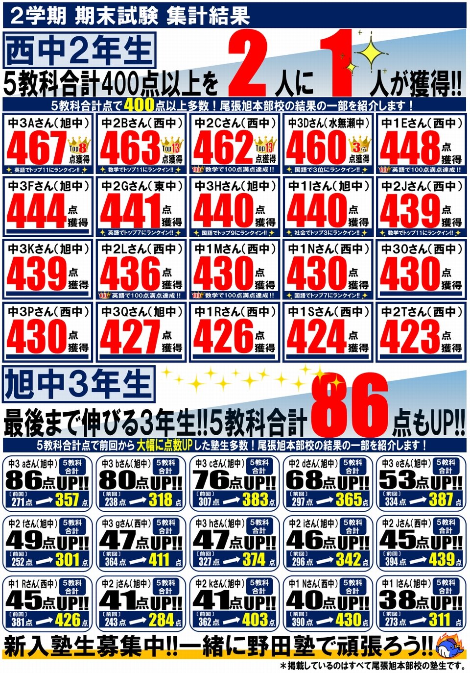 | 中2 | 特別選抜 | 午後7:20~10:00 | ‐ | ‐ | ‐ | ● | ▲ | ‐ | ● |